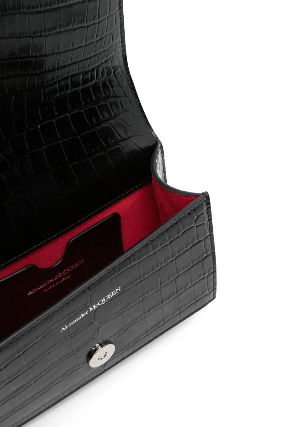Defiant attitude meets refined elegance. That's what this mini Jewelled crocodile-embossed satchel is all about, thanks to its crocodile effect and signature Four Ring handle. Only Alexander McQueen can deliver this kind of impact.
